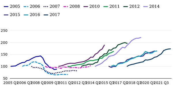 Zdroj: INREV k lednu 2023. V roce 2009 a 2013 nebyly uvedeny žádné fondy s přidanou hodnotou. Indexováno na 100 při první závěrce. Minulá výkonnost nepředpovídá budoucí výnosy.